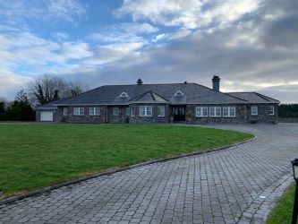 A large private detached dormer style family residence, with a double garage and a chalet in the townland of Killafeen in Gort. Set on a site of c.2.2acres this hugely impressive property comprises approximately 610sq.mtrs of living space and is finished to the highest standards. On landscaped gardens, with a limestone finish facade, the house has stunning views over Lough Cutra and its surrounds. Being offered to the market with the benfit of electric gates, tarmac driveway, extensive marble tiling, underfloor heating, wood flors and a basement storeroom. Just ten minutes drive to Gort, with all amenities close to hand.